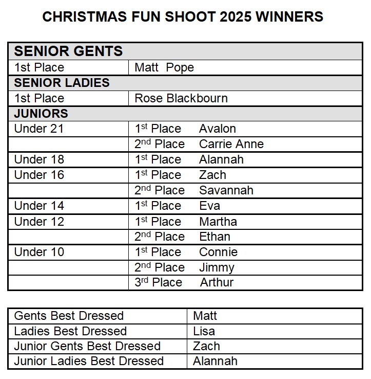 Home Try Archery Have-a-go-sessions Beginners Courses Join Our Club Club Fees Location Types Of Archery Archery GB About Us Our History Open Competitions Events Competition Scores Entry Forms Members Calendar Archery Etiquette Shooting Times Weather Forecast Clothing Blank Score Sheets Code Of Conduct Classifications BCCB Committee Documents Club Scores Photo Gallery Photos Contact Us Get In Touch CLUB COMPETITION SCORES PLEASE NOTE For Indoor Classifications awarded July 2023 to June 2024, Personal Best Score Indoor Rounds and Indoor Club Record 1975 to 2024 please go to ‘DOCUMENTS‘. 2025 RESULTS TO VIEW THE RECORDS BELOW CLICK ON THE TITLES 2025 COMPETITIONS PORTSMOUTH COMPETITION VEGAS COMPETITION EASTER BUNNY SHOOT SPRING CLOUT ANNIVERSARY SHOOT JUNIOR COMPETITION AMERICAN & WINDSOR COMPETITION END of SEASON SHOOT AUTUMN CLOUT AUTUMN TARGET SHOOT CHRISTMAS FUN SHOOT 2024 COMPETITIONS PORTSMOUTH COMPETITION VEGAS COMPETITION EASTER BUNNY SHOOT SPRING CLOUT ANNIVERSARY SHOOT JUNIOR COMPETITION 7. 7. 2024 ALBION COMPETITION END OF SEASON SHOOT AUTUMN CLOUT AUTUMN TARGET SHOOT CHRISTMAS FUN SHOOT 2023 COMPETITIONS PORTSMOUTH COMPETITION VEGAS COMPETITION SPRING CLOUT EASTER BUNNY SHOOT ANNIVERSARY SHOOT ALBION SHOOT END OF SEASON SHOOT AUTUMN CLOUT AUTUMN TARGET SHOOT CHRISTMAS FUN SHOOT 2022 COMPETITIONS PORTSMOUTH COMPETITION VEGAS COMPETITION SPRING CLOUT ANNIVERSARY SHOOT MEDIEVAL SHOOT ALBION SHOOT NEW ARCHERS CHALLENGE AUTUMN CLOUT AUTUMN TARGET SHOOT CHRISTMAS FUN SHOOT 2021 COMPETITIONS AUTUMN CLOUT CHRISTMAS FUN SHOOT 2020 COMPETITIONS PORTSMOUTH SHOOT VEGAS SHOOT 2019 COMPETITIONS PORTSMOUTH SHOOT SPRING CLOUT VEGAS SHOOT NEW STARTER CHALLENGE MEDIEVAL SHOOT JUNIOR SHOOT EASTER BUNNY SHOOT END OF SEASON SHOOT ANNIVERSARY SHOOT ALBION SHOOT AUTUMN CLOUT CHRISTMAS FUN SHOOT 2018 COMPETITIONS PORTSMOUTH SHOOT SPRING CLOUT VEGAS SHOOT NEW STARTER CHALLENGE JUNIOR COMPETITION AUTUMN TARGET SHOOT ANNIVERSARY SHOOT ALBION WINDSOR SHOOT AUTUMN CLOUT CHRISTMAS FUN SHOOT 2017 COMPETITIONS PORTSMOUTH SHOOT SPRING CLOUT WORCESTER SHOOT NEW STARTER CHALLENGE MEDIEVAL SHOOT JUNIOR COMPETITION END OF SEASON SHOOT EASTER BUNNY SHOOT AUTUMN TARGET SHOOT AUTUMN CLOUT ANNIVERSARY SHOOT ALBION WINDSOR SHOOT 2016 COMPETITIONS PORTSMOUTH SHOOT SPRING CLOUT MID SEASON SHOOT MEDIEVAL SHOOT JUNIOR COMPETITON END OF SEASON SHOOT EASTER BUNNY SHOOT AUTUMN TARGET SHOOT AUTUMN CLOUT ANNIVERSARY SHOOT ANNIVERSARY SHOOT ALBION SHOOT WORCESTER SHOOT 2015 COMPETITIONS JANUARY CHALLENGE PORTSMOUTH SHOOT MEDIEVAL SHOOT END OF SEASON SHOOT EASTER BUNNY SHOOT ANNIVERSARY SHOOT ALBION SHOOT WORCESTER SHOOT AUTUMN CLOUT CHRISTMAS SHOOT SPRING CLOUT 2014 COMPETITIONS SPRING CLOUT EASTER SHOOT MEDIEVAL SHOOT ALBION SHOOT ANNIVERSARY SHOOT ALBION SHOOT AUTUMN CLOUT CHRISTMAS SHOOT