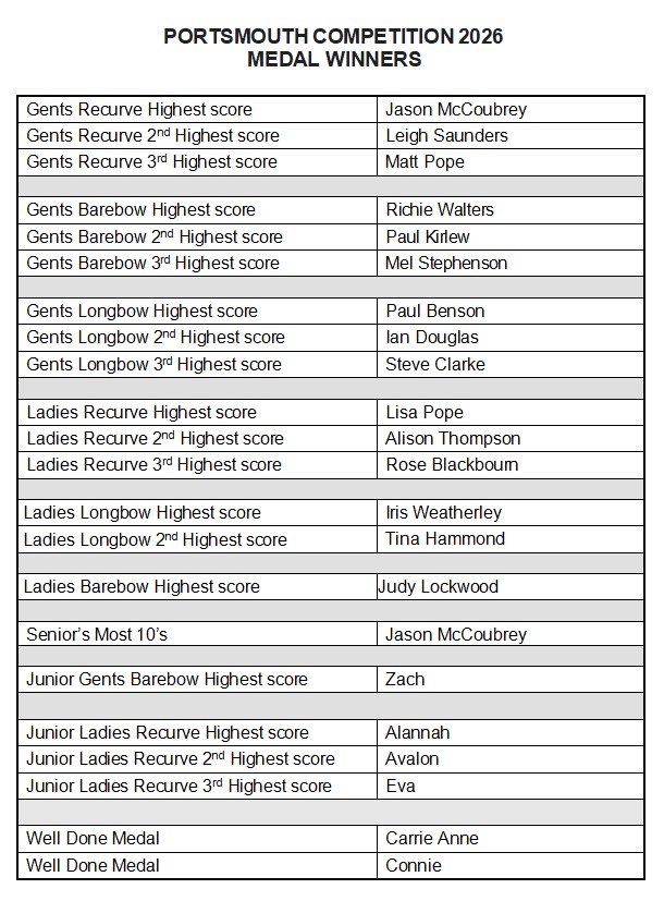 Home Try Archery Have-a-go-sessions Beginners Courses Join Our Club Club Fees Location Types Of Archery Archery GB About Us Our History Open Competitions Events Competition Scores Entry Forms Members Calendar Archery Etiquette Shooting Times Weather Forecast Clothing Blank Score Sheets Code Of Conduct Classifications BCCB Committee Documents Club Scores Photo Gallery Photos Contact Us Get In Touch CLUB COMPETITION SCORES PLEASE NOTE For Indoor Classifications awarded July 2023 to June 2024, Personal Best Score Indoor Rounds and Indoor Club Record 1975 to 2024 please go to ‘DOCUMENTS‘. 2026 RESULTS 2025 RESULTS TO VIEW THE RECORDS BELOW CLICK ON THE TITLES 2026 COMPETITIONS PORTSMOUTH COMPETITION VEGAS COMPETITION EASTER BUNNY SHOOT SPRING CLOUT ANNIVERSARY SHOOT 2025 COMPETITIONS PORTSMOUTH COMPETITION VEGAS COMPETITION EASTER BUNNY SHOOT SPRING CLOUT ANNIVERSARY SHOOT JUNIOR COMPETITION AMERICAN & WINDSOR COMPETITION END of SEASON SHOOT AUTUMN CLOUT AUTUMN TARGET SHOOT CHRISTMAS FUN SHOOT 2024 COMPETITIONS PORTSMOUTH COMPETITION VEGAS COMPETITION EASTER BUNNY SHOOT SPRING CLOUT ANNIVERSARY SHOOT JUNIOR COMPETITION 7. 7. 2024 ALBION COMPETITION END OF SEASON SHOOT AUTUMN CLOUT AUTUMN TARGET SHOOT CHRISTMAS FUN SHOOT 2023 COMPETITIONS PORTSMOUTH COMPETITION VEGAS COMPETITION SPRING CLOUT EASTER BUNNY SHOOT ANNIVERSARY SHOOT ALBION SHOOT END OF SEASON SHOOT AUTUMN CLOUT AUTUMN TARGET SHOOT CHRISTMAS FUN SHOOT 2022 COMPETITIONS PORTSMOUTH COMPETITION VEGAS COMPETITION SPRING CLOUT ANNIVERSARY SHOOT MEDIEVAL SHOOT ALBION SHOOT NEW ARCHERS CHALLENGE AUTUMN CLOUT AUTUMN TARGET SHOOT CHRISTMAS FUN SHOOT 2021 COMPETITIONS AUTUMN CLOUT CHRISTMAS FUN SHOOT 2020 COMPETITIONS PORTSMOUTH SHOOT VEGAS SHOOT 2019 COMPETITIONS PORTSMOUTH SHOOT SPRING CLOUT VEGAS SHOOT NEW STARTER CHALLENGE MEDIEVAL SHOOT JUNIOR SHOOT EASTER BUNNY SHOOT END OF SEASON SHOOT ANNIVERSARY SHOOT ALBION SHOOT AUTUMN CLOUT CHRISTMAS FUN SHOOT 2018 COMPETITIONS PORTSMOUTH SHOOT SPRING CLOUT VEGAS SHOOT NEW STARTER CHALLENGE JUNIOR COMPETITION AUTUMN TARGET SHOOT ANNIVERSARY SHOOT ALBION WINDSOR SHOOT AUTUMN CLOUT CHRISTMAS FUN SHOOT 2017 COMPETITIONS PORTSMOUTH SHOOT SPRING CLOUT WORCESTER SHOOT NEW STARTER CHALLENGE MEDIEVAL SHOOT JUNIOR COMPETITION END OF SEASON SHOOT EASTER BUNNY SHOOT AUTUMN TARGET SHOOT AUTUMN CLOUT ANNIVERSARY SHOOT ALBION WINDSOR SHOOT 2016 COMPETITIONS PORTSMOUTH SHOOT SPRING CLOUT MID SEASON SHOOT MEDIEVAL SHOOT JUNIOR COMPETITON END OF SEASON SHOOT EASTER BUNNY SHOOT AUTUMN TARGET SHOOT AUTUMN CLOUT ANNIVERSARY SHOOT ANNIVERSARY SHOOT ALBION SHOOT WORCESTER SHOOT 2015 COMPETITIONS JANUARY CHALLENGE PORTSMOUTH SHOOT MEDIEVAL SHOOT END OF SEASON SHOOT EASTER BUNNY SHOOT ANNIVERSARY SHOOT ALBION SHOOT WORCESTER SHOOT AUTUMN CLOUT CHRISTMAS SHOOT SPRING CLOUT 2014 COMPETITIONS SPRING CLOUT EASTER SHOOT MEDIEVAL SHOOT ALBION SHOOT ANNIVERSARY SHOOT ALBION SHOOT AUTUMN CLOUT CHRISTMAS SHOOT